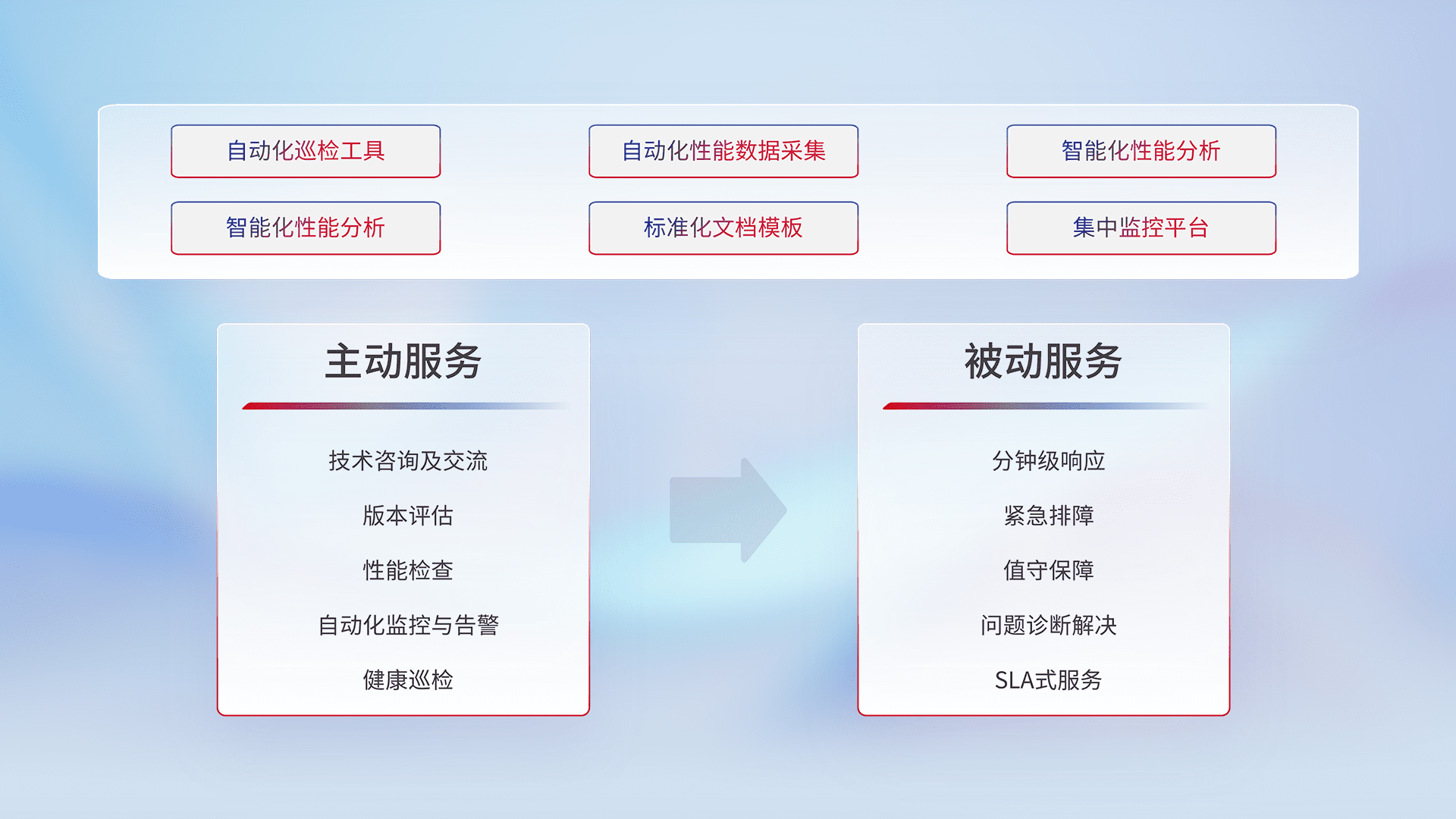 智能化工具和标准化文档,,,,保障服务质量,,,,提供主动服务(包含技术咨询、、版本评估、、性能检查、、、自动化监控与告警、、、、健康巡检)和被动服务包含(分钟级响应、、、紧急排障、、值守保障、、、问题诊断解决、、SLA服务)。。。